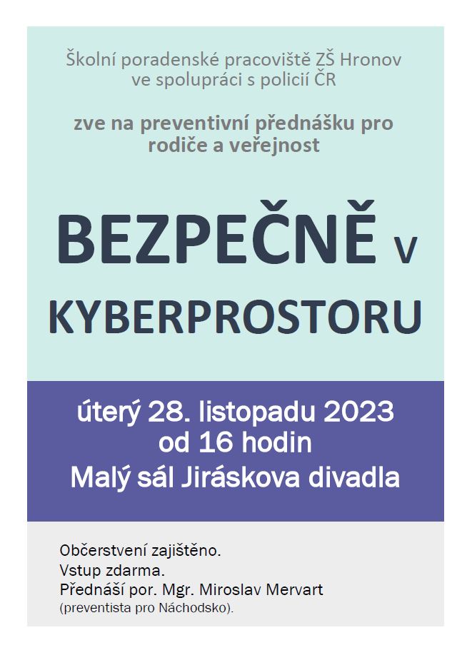 Školní poradenské pracoviště ZŠ a MŠ Hronov ve spolupráci s policií ČR Vás zve na preventivní přednášku pro rodiče a veřejnost "BEZPEČNĚ V KYBERPROSTORU", která se koná v úterý 28. listopadu 2023 od 16 hodin v Malém sále Jiráskova Divadla.