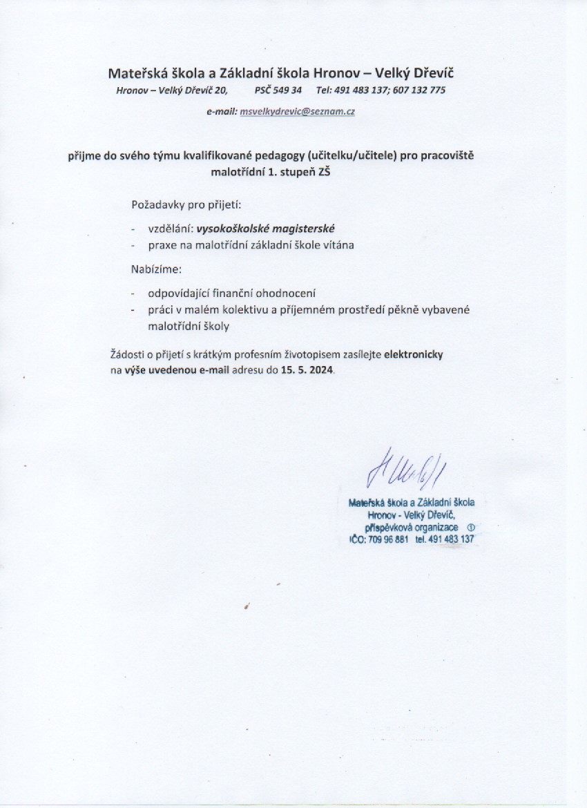 přijme do svého týmu kvalifikované pedagogy (učitelku/učitele) pro pracoviště malotřídní 1. stupeň ZŠ