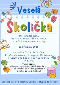 Milí předškoláci,než se stanete žáky 1. třídy, srdečně vás zveme v úterý, 11. března 2025, na společné setkání do naší...