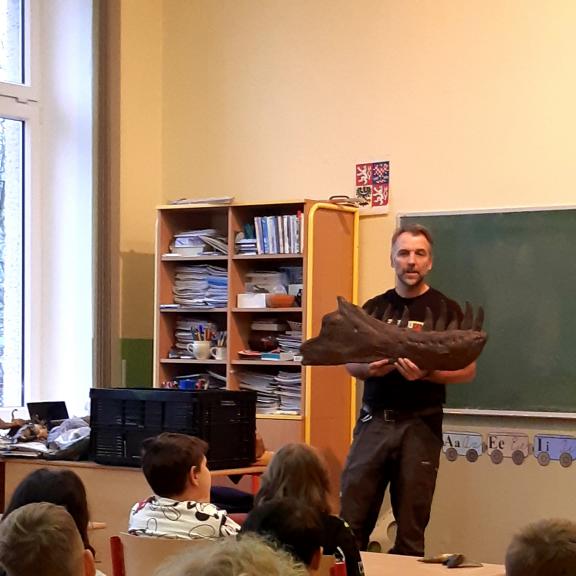 Ve čtvrtek 24. 4. 2025 nás navštívil RNDr. Štěpán Rak, Ph.D. profesionální paleontolog, autor Albi mluvící knihy Dinosauři. Viděli jsme mnoho vzácných zkamenělin a exponátů, měli možnost držet v ruce odlitky zubů a drápů dinosaurů a dokonce i opravdový zub Megalodona a Spinosaura. Naučný program o dinosaurech žáky zaujal.