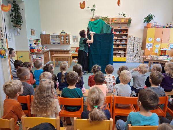V úterý 7.10. jsme ve školce přivítali paní Holasovou, která nám zahrála dvě krásné pohádky. " O Palečkovi" a " Hrnečku, vař!". Moc děkujeme za krásný kulturní zážitek.