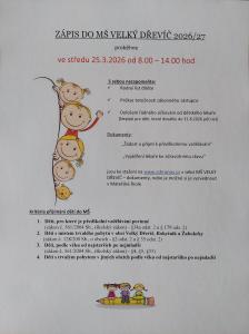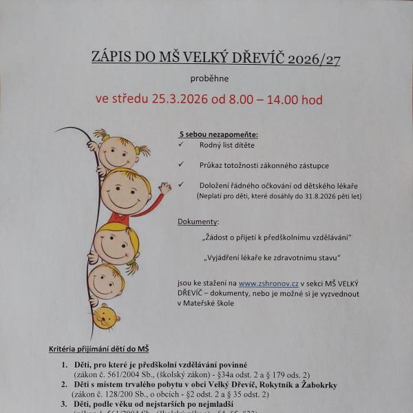 ZÁPIS DO MŠ VELKÝ DŘEVÍČ 2026/27 proběhne ve středu 25.3.2026 od 8.00 – 14.00 hod S sebou nezapomeňte: ü Rodný list dítěte ü Průkaz totožnosti zákonného zástupce ü ...